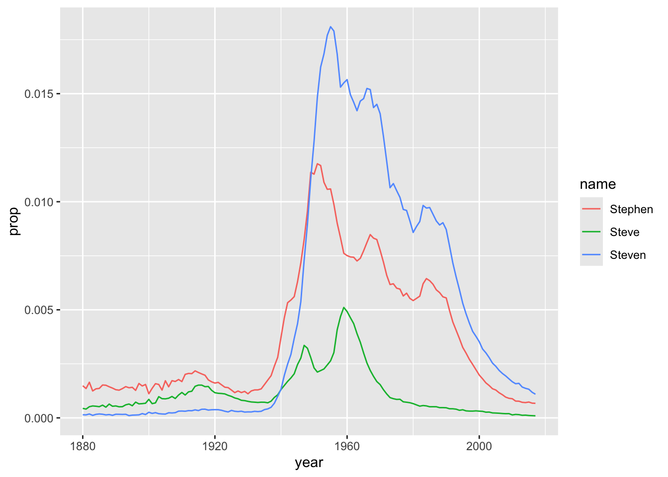 Now, edit my code above to create a new dataset (don’t worry if you’re not sure about what every single bit of the code is doing, just dive in and go for it). Pick a handful of names to compare how popular they each are (these could be different spellings of your own name, like I did, but you can choose any pair (or trio, etc.) of names that are present in the dataset). Make the new plot, changing the name of the first argument – steve – in ggplot() to the name of your new dataset.