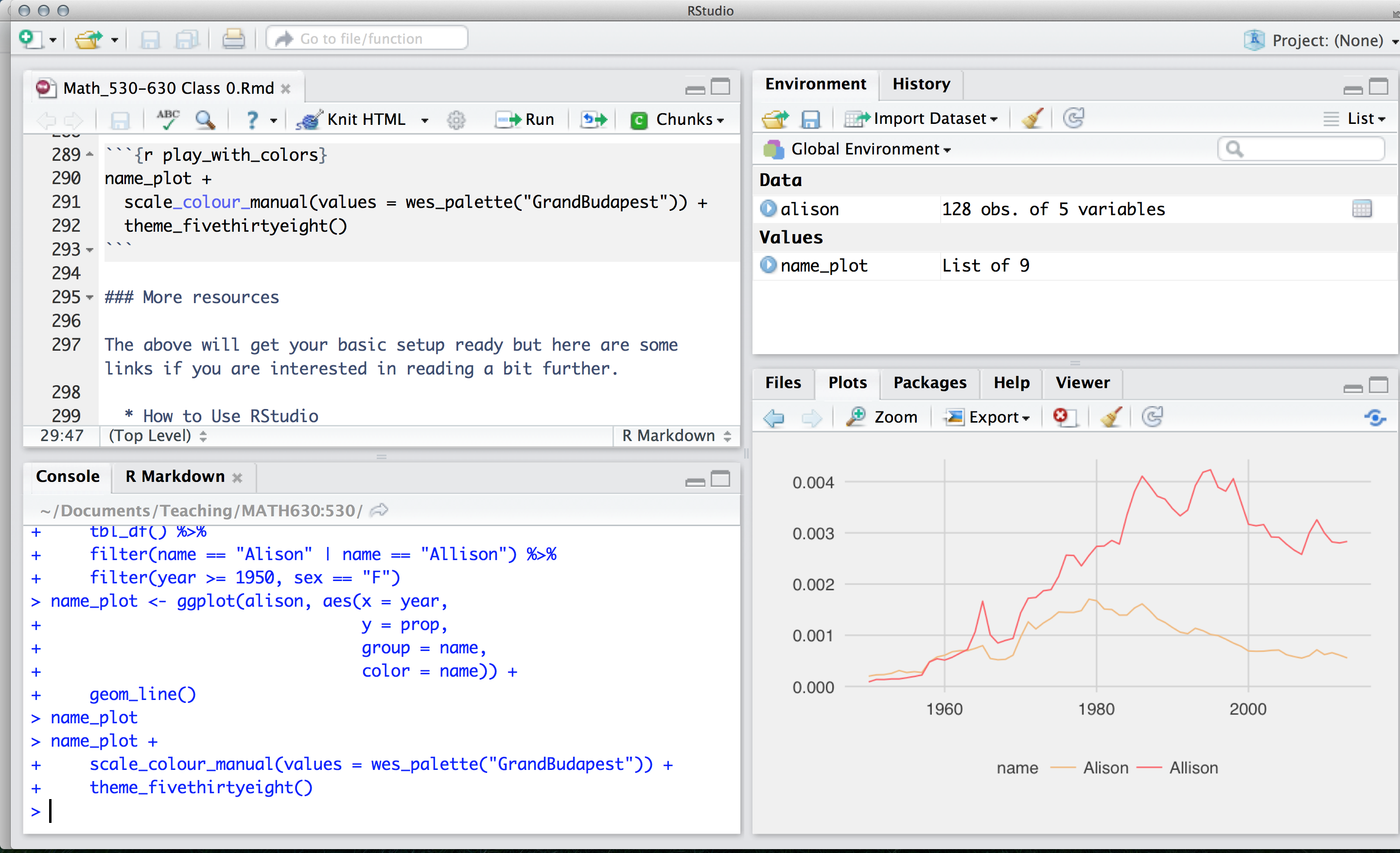 Now, if you are following along precisely, you will not see your plot! This is because we saved the result of ggplot with a name (name.plot) But check out the top right pane in RStudio again: under Data you should see name.plot— so it is there, you just have to ask for it. Here’s how: