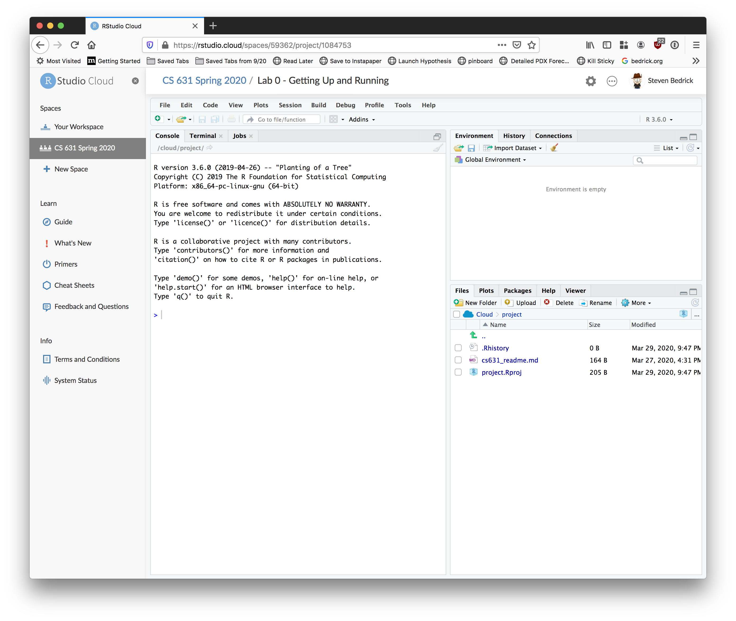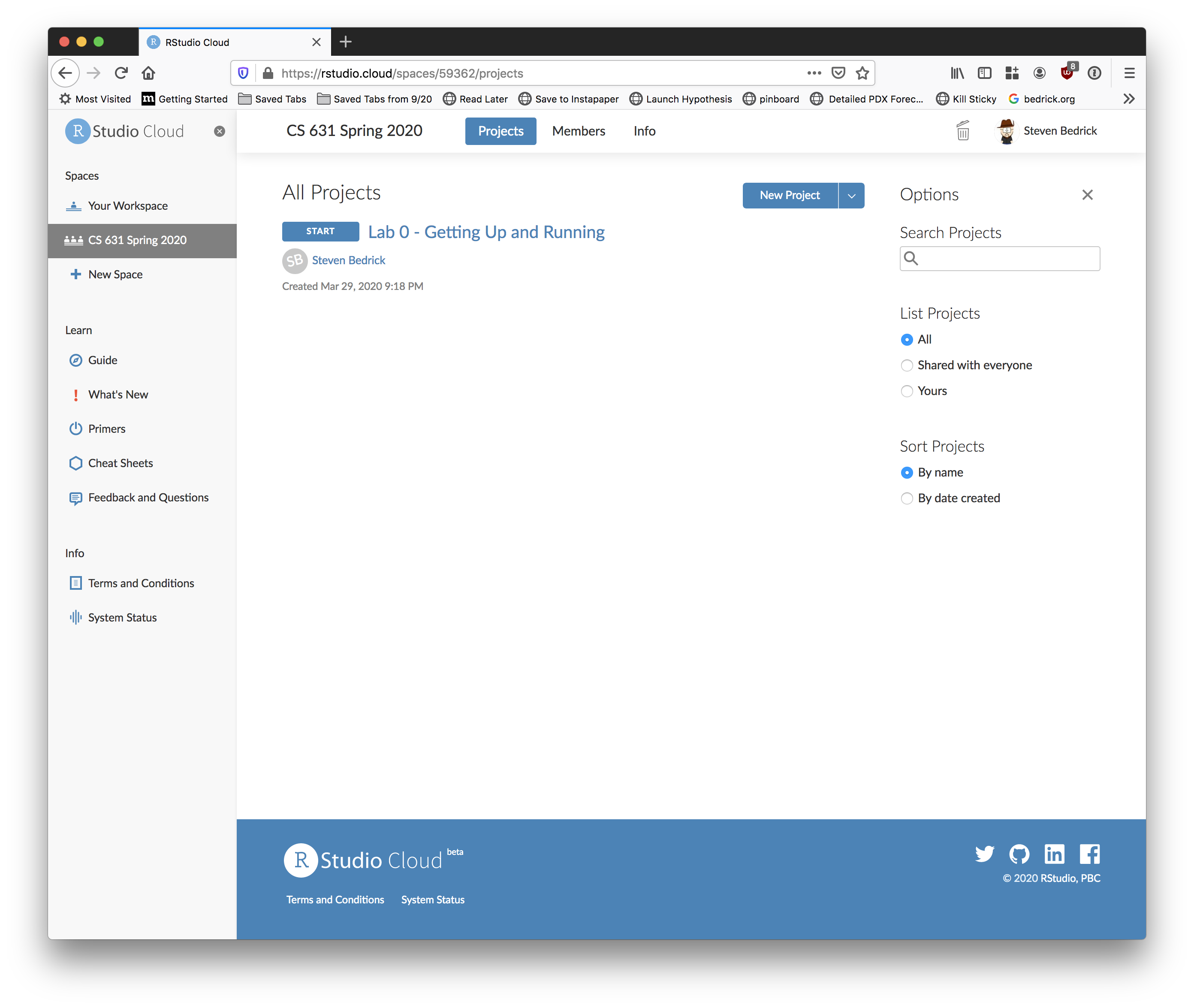 You can create your own projects from scratch in the class workspace, or you can start with one of the template projects. For labs and some assignments, I will have put together templates for you to start from. When you click “start” next to a template project, RStudio Cloud makes you a personal copy of that project, and then all of your changes and work are specific to your copy.