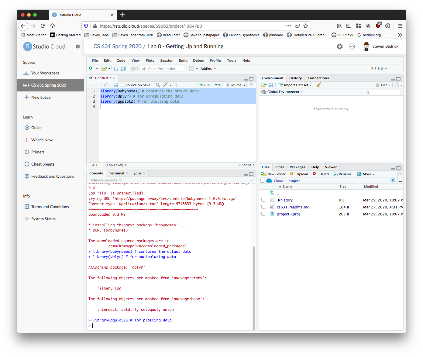 One nice thing about using RStudio Cloud is that a workspace project (like the one you’ve just opened up) can come pre-loaded with the necessary libraries, which is a real time-saver in a classroom environment. For example, the project you’re using right now already has the devtools package installed. But for the next part of the lab, you’ll need to install one additional package.