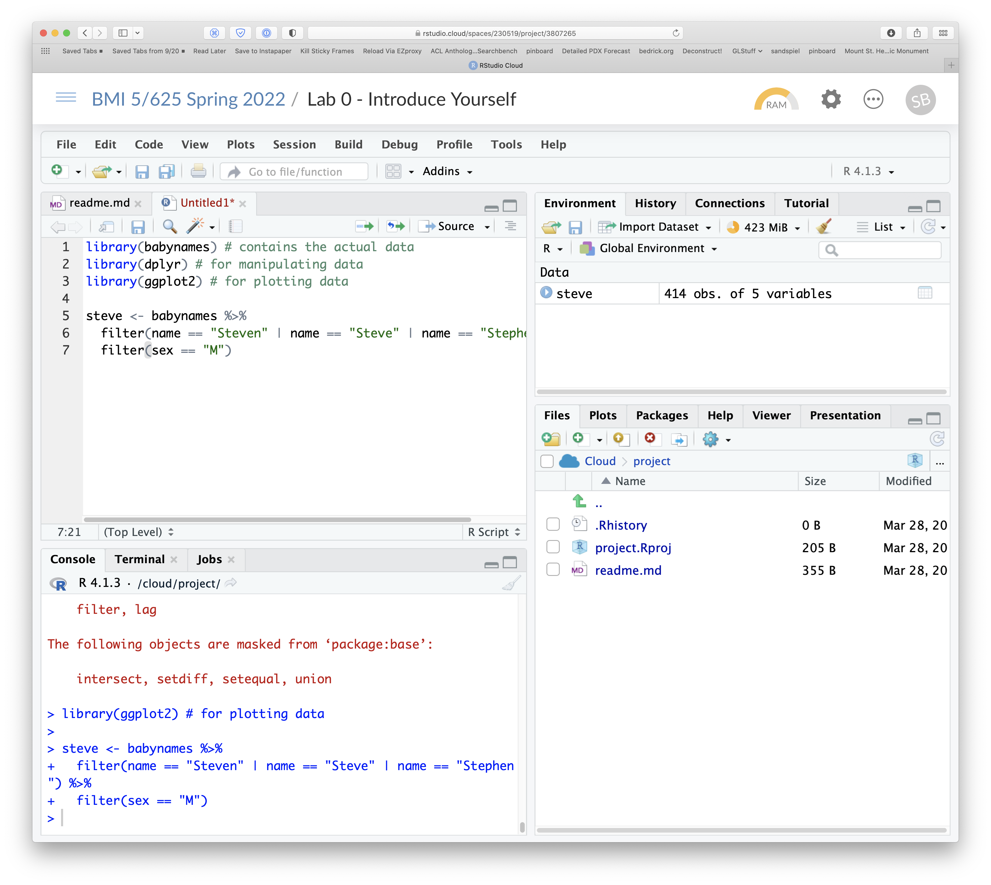 • The first line makes a new dataset called steve, whose “life” begins with a copy of the babynames dataset- the %>% tells you we are doing some other stuff to it later.