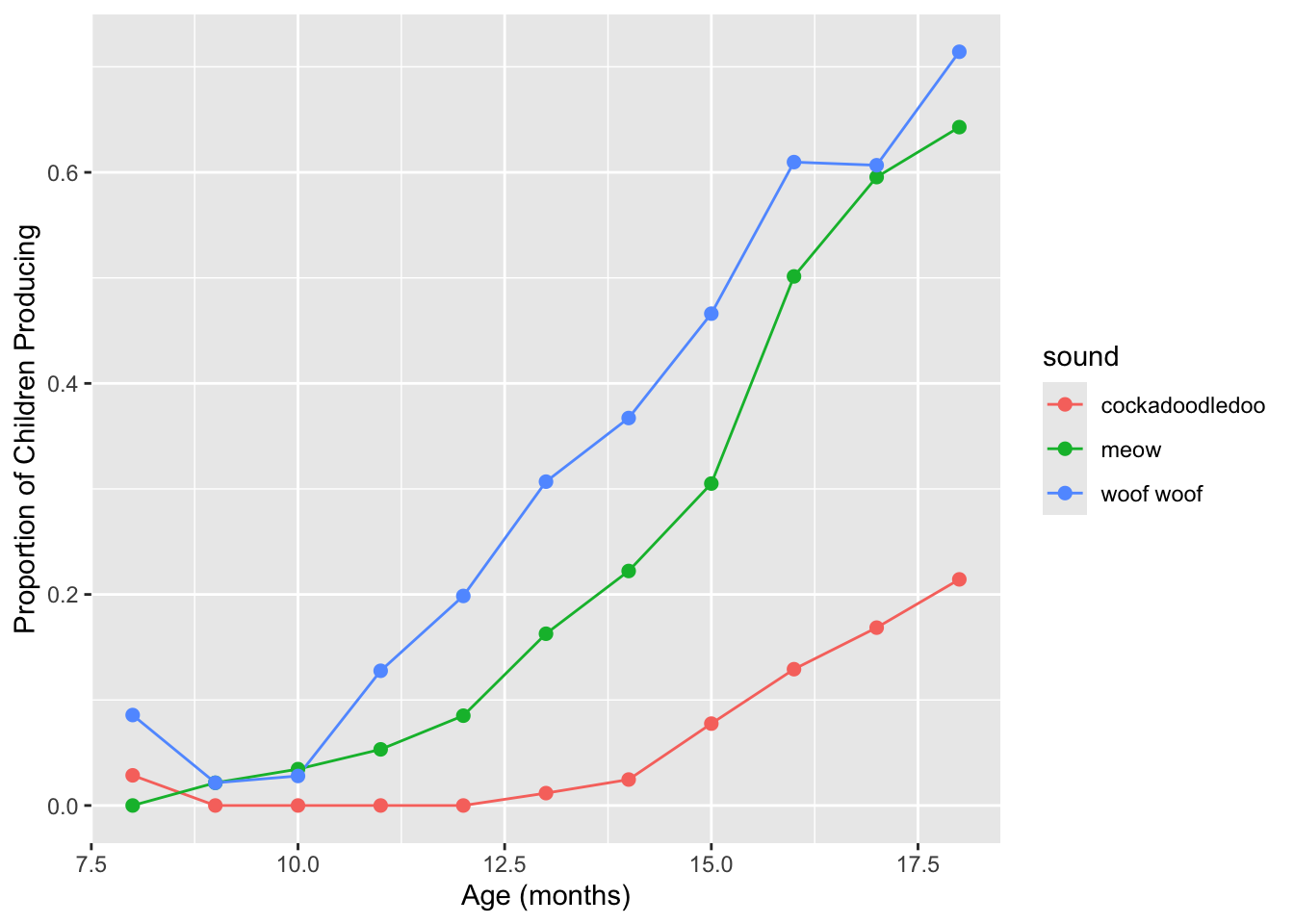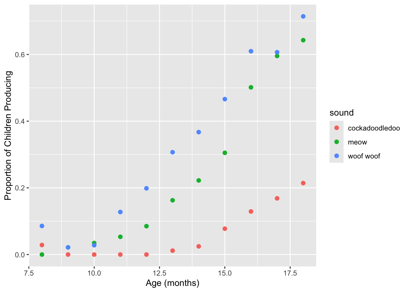 age: child age in monthssound: a string describing a type of animal soundkids_produce: the number of parents who answered “yes,
