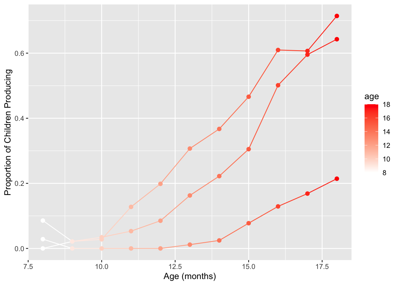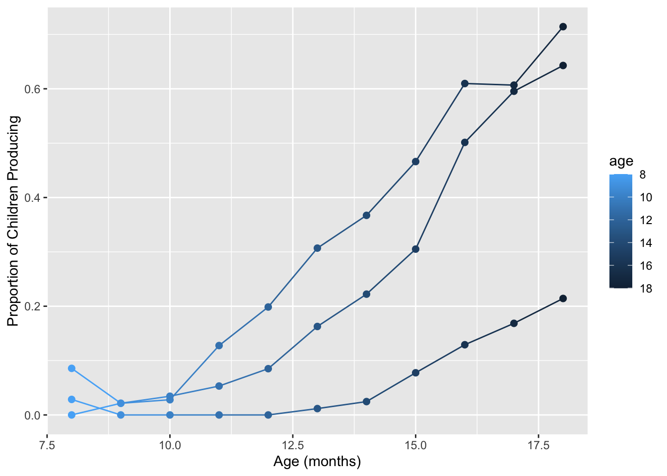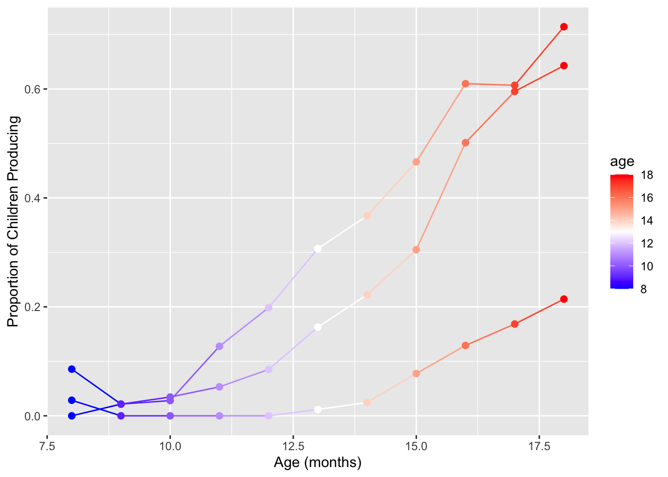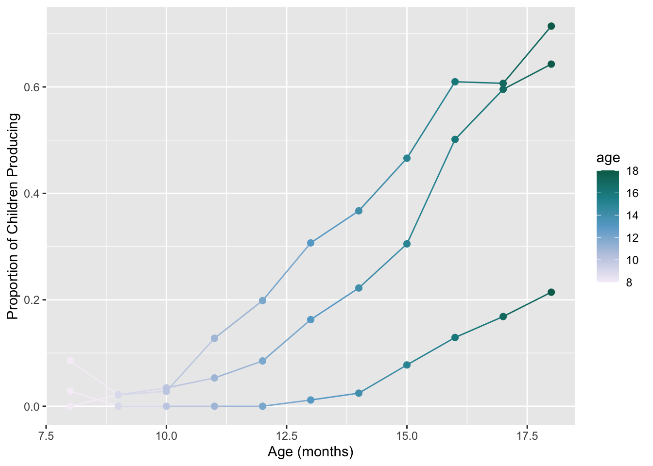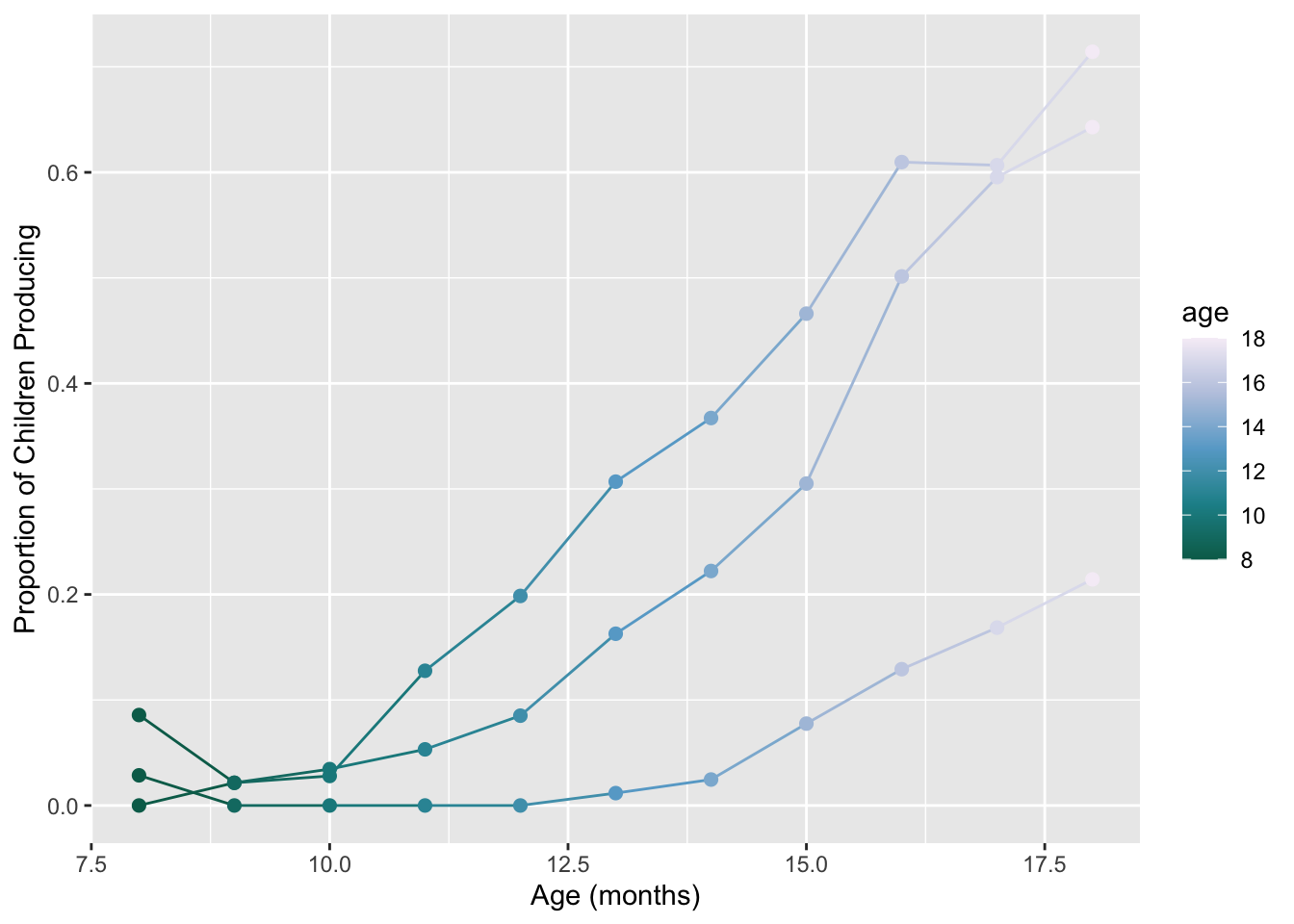 labs(x = "Age (mos)", y = "Proportion of Children Producing") +