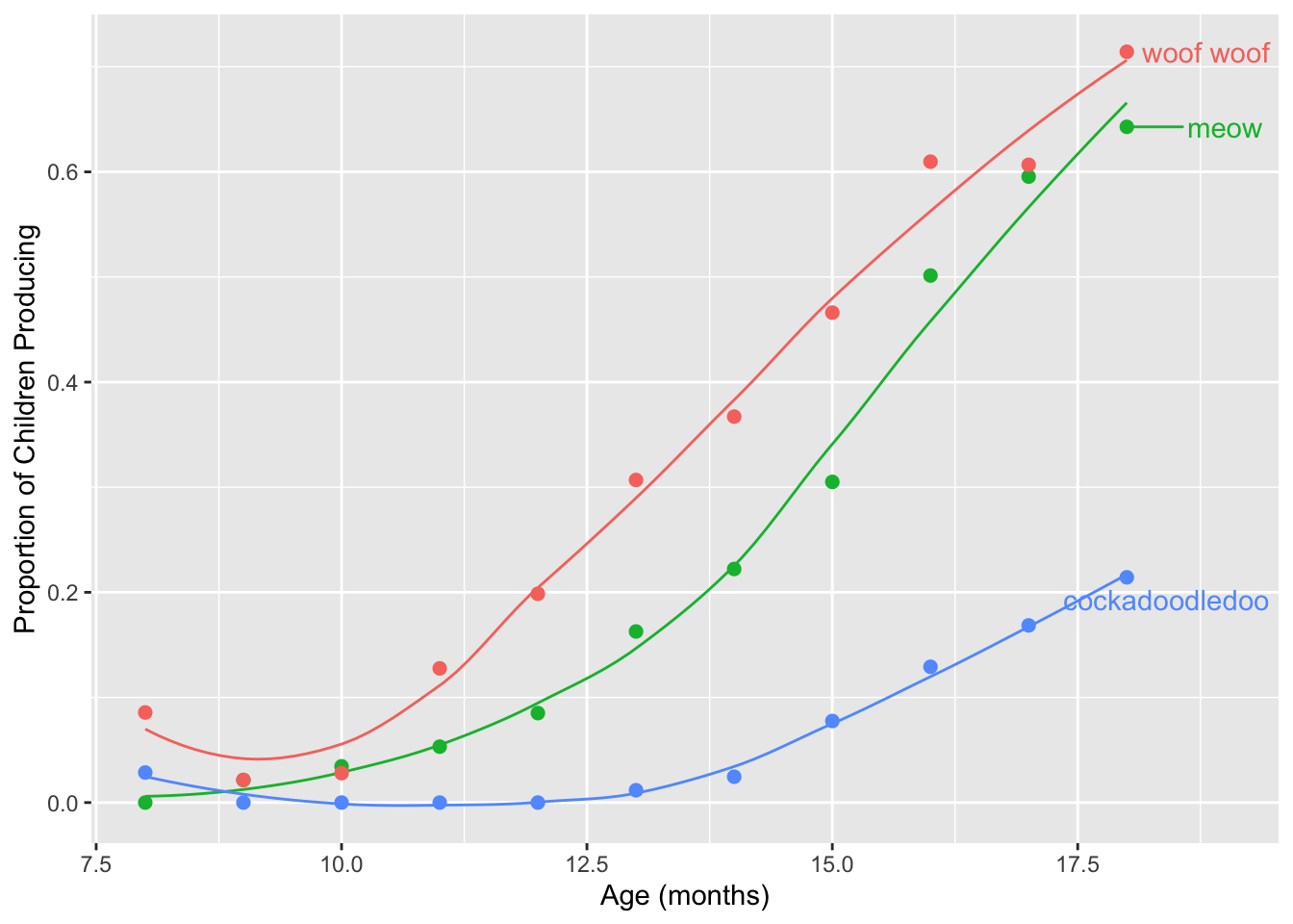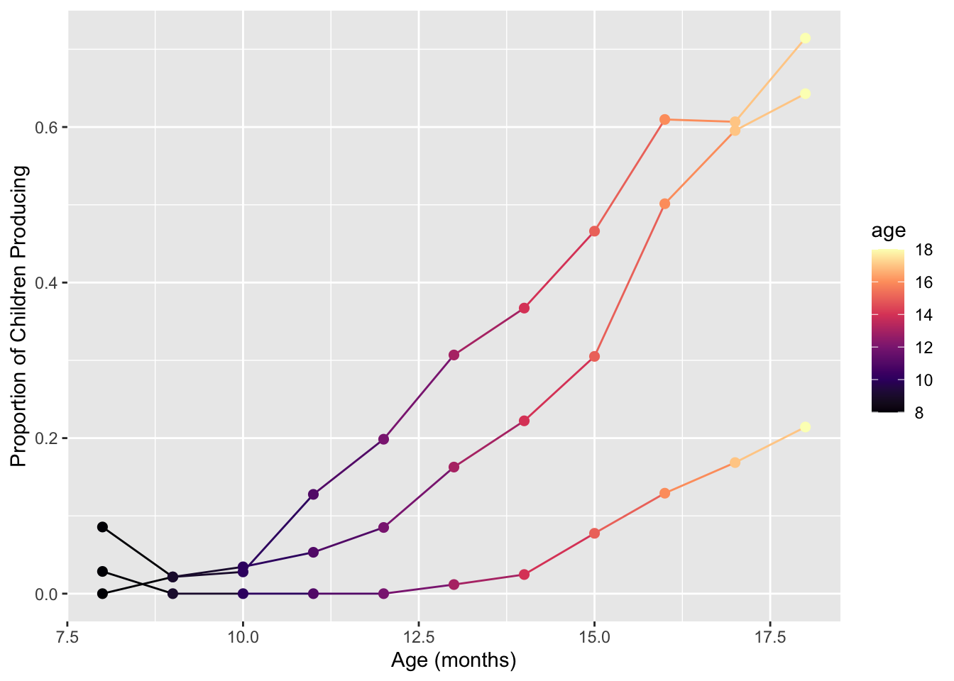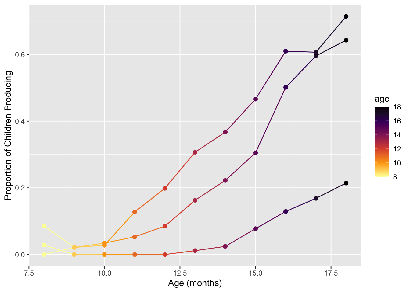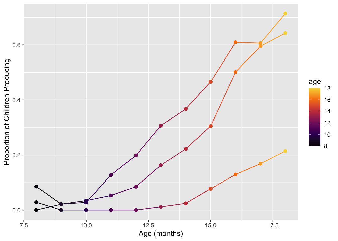 labs(x = "Age (mos)", y = "Proportion of Children Producing") +