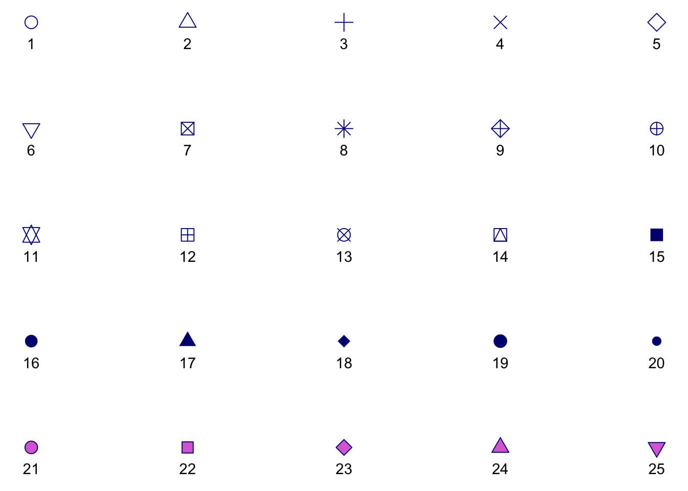 s + geom_point(aes(shape = z), size = 4, colour = "navy", fill = "orchid")