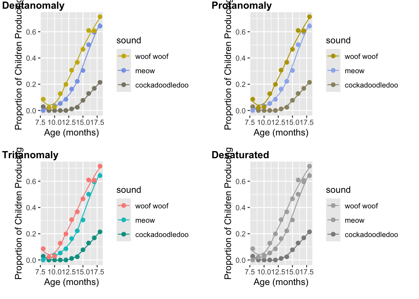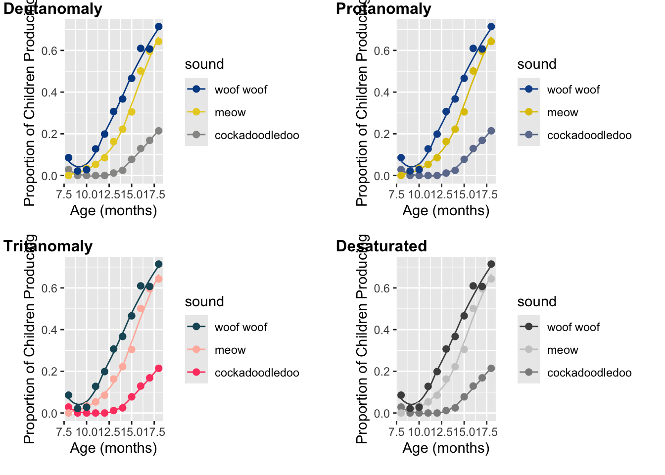 However, in the following plots, we’ll treat age as a continuous variable plotted across the x-axis. In some contexts, this kind of variable could be treated as a ordinal variable. However, for color purposes, this would not ideal here since there are 11 “categories” (see http://serialmentor.com/dataviz/color-pitfalls.html). Age has a natural and meaningful order: a child who is 9 months old is 1 month older than one who is 8 months old. So, we’ll use that natural ordering to our advantage and not use color to represent age as a variable. When you do apply a continuous color palette, you’ll want to use color to your advantage to represent data values.